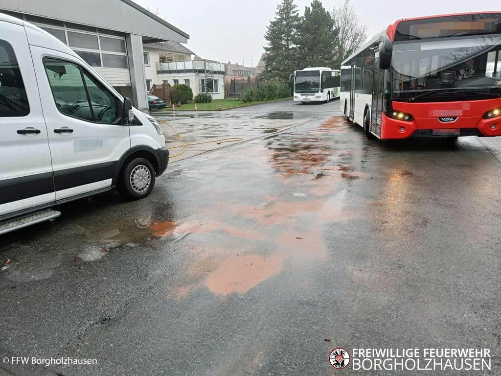 Lage bei Eintreffen: viel Öl auf Straße durch defekten Linienbus Maßnahmen: Fachunternehmen zur Reinigung nachgefordert, Einsatzstelle übergeben