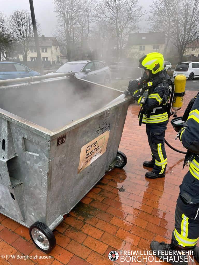 Lage bei Eintreffen: Container in Schwelbrand, keine offenen Flammen Maßnahmen: Schwelbrand mittels Schnellangriff gelöscht