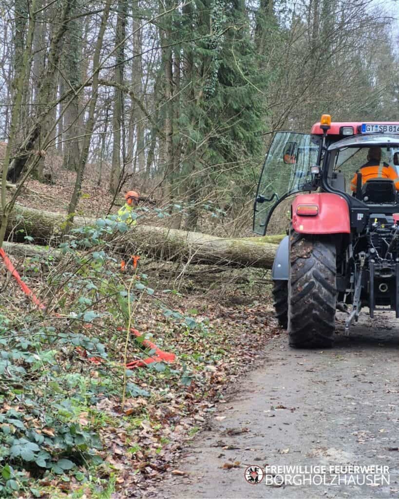 Gemeinsam mit dem städtischen Bauhof wurde der Baum zersägt und mit dem Trecker von der Straße geschoben.