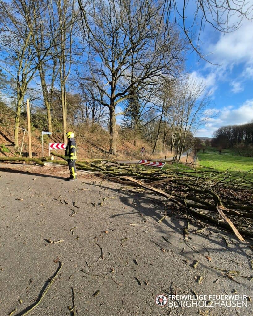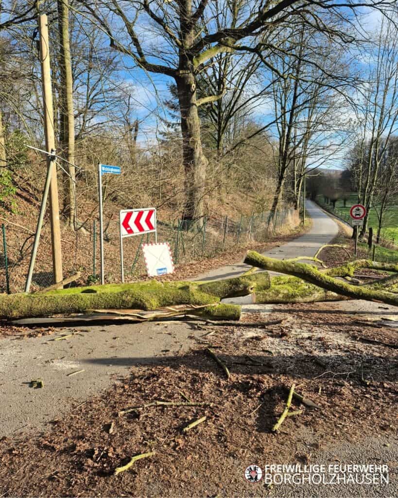 Ein Baum war von einem Waldgrundstück auf die Straße gefallen und hatte die Straße vollständig versperrt. Eine Telefonleitung wurde ebenfalls beschädigt.