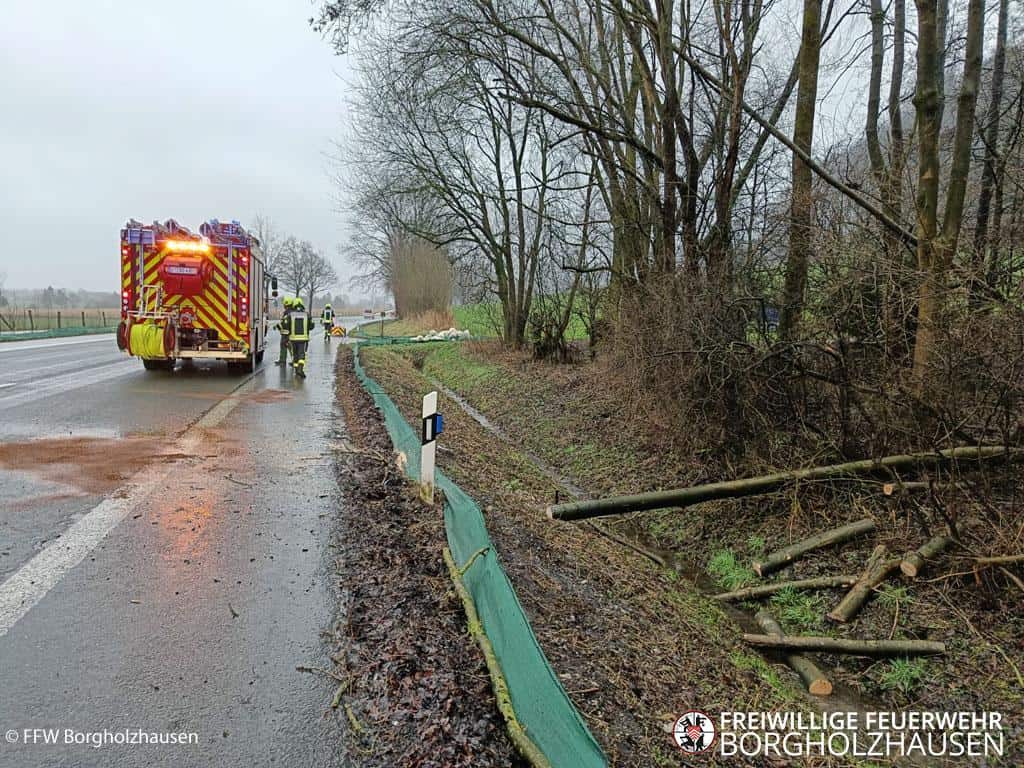 Lage bei Eintreffen: Ein ca. 30 cm dicker Baum war auf der Bielefelder Straße durch Windbruch niedergegangen und hatte die eine Hälfte der Fahrbahn blockiert.