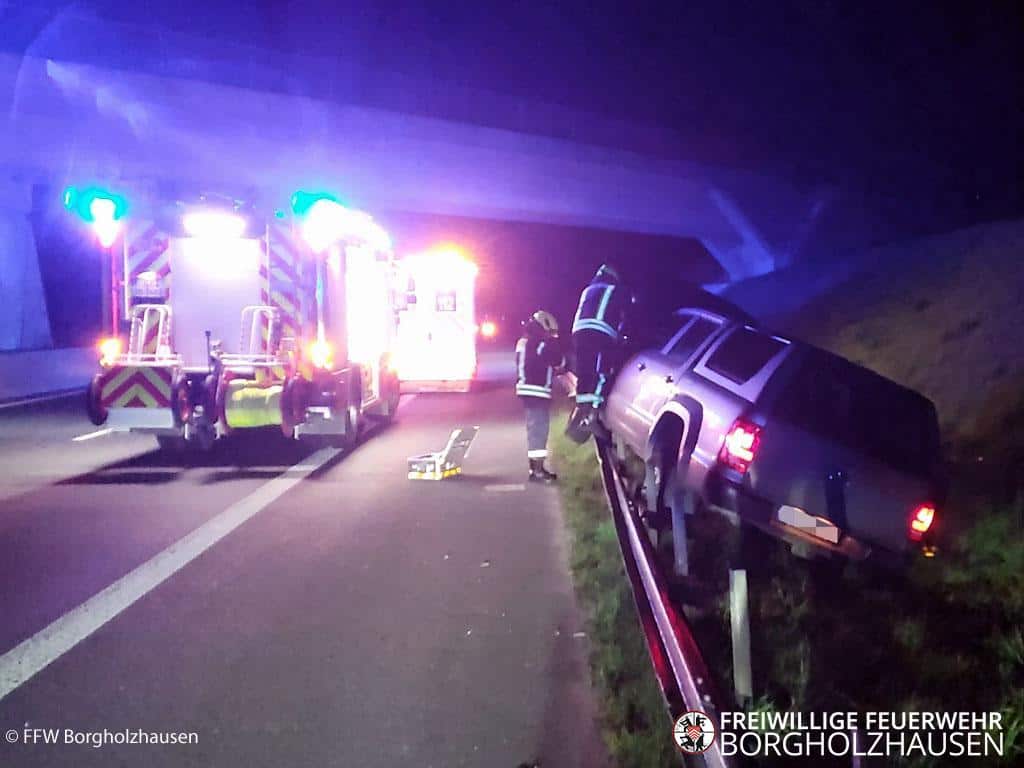 Ein PKW war ca. 500 Meter über die rechte Leitplanke gefahren und war dann neben der Leitplanke im Seitenbereich der Straße zum Stehen gekommen.