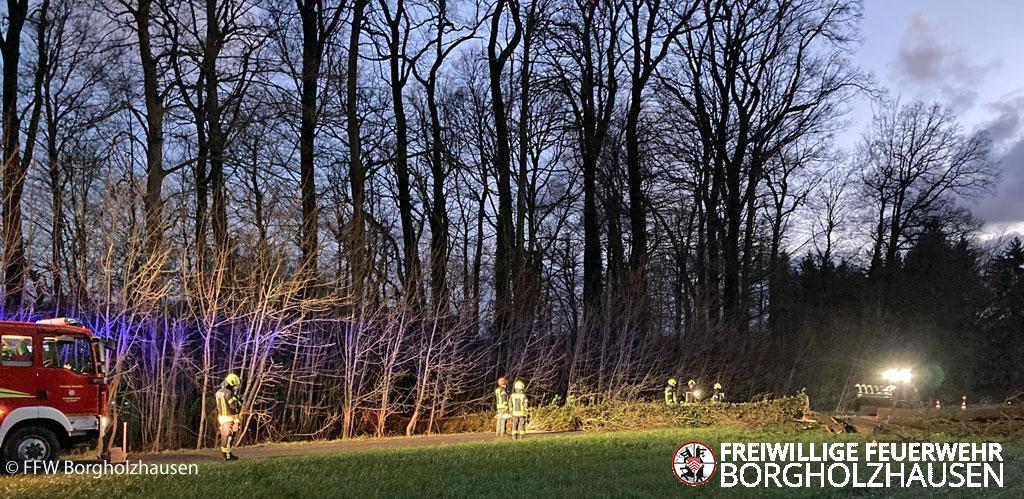 Lage bei Eintreffen: Baum, ca. 1 – 1,5 m im Durchmesser, lag quer über der Fahrbahn.