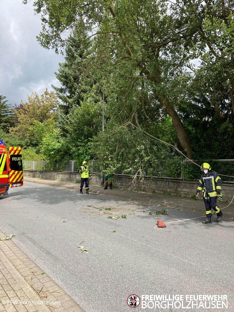 Maßnahmen: Straße gesperrt, Ast mittels Hochentaster abgesägt und Straße gereinigt