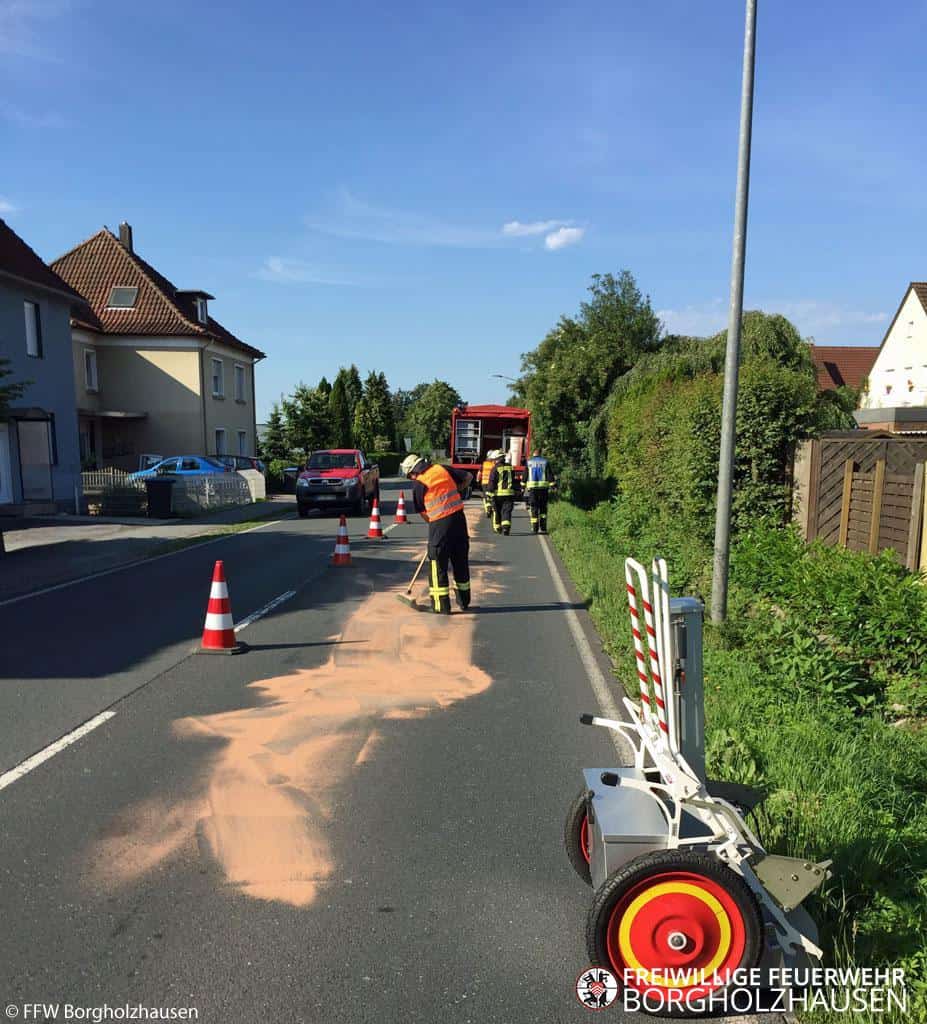 Maßnahmen: Abstreuen mit Bindemittel, teilweise Sperrung der Fahrbahn während des Einsatzes zum