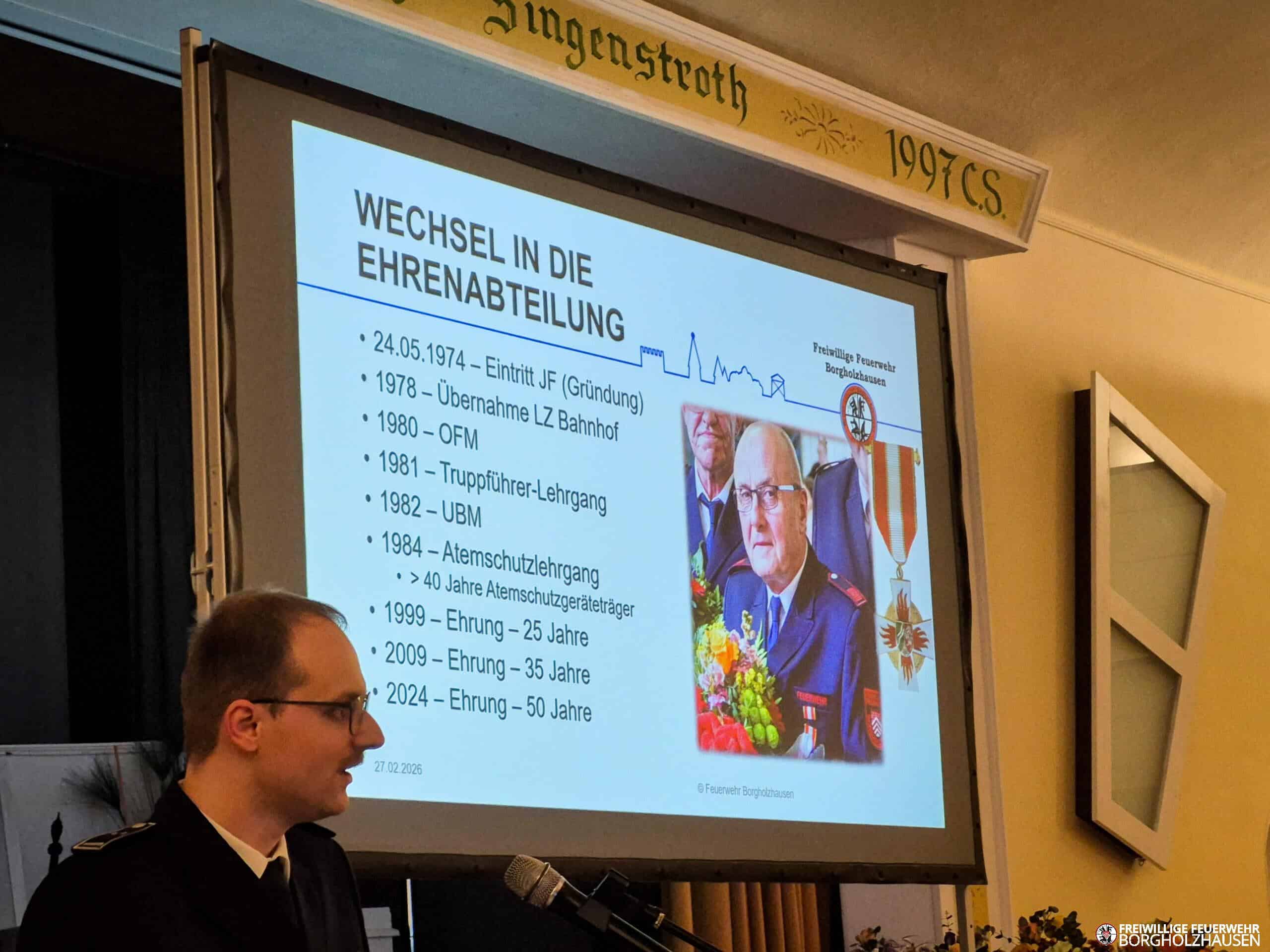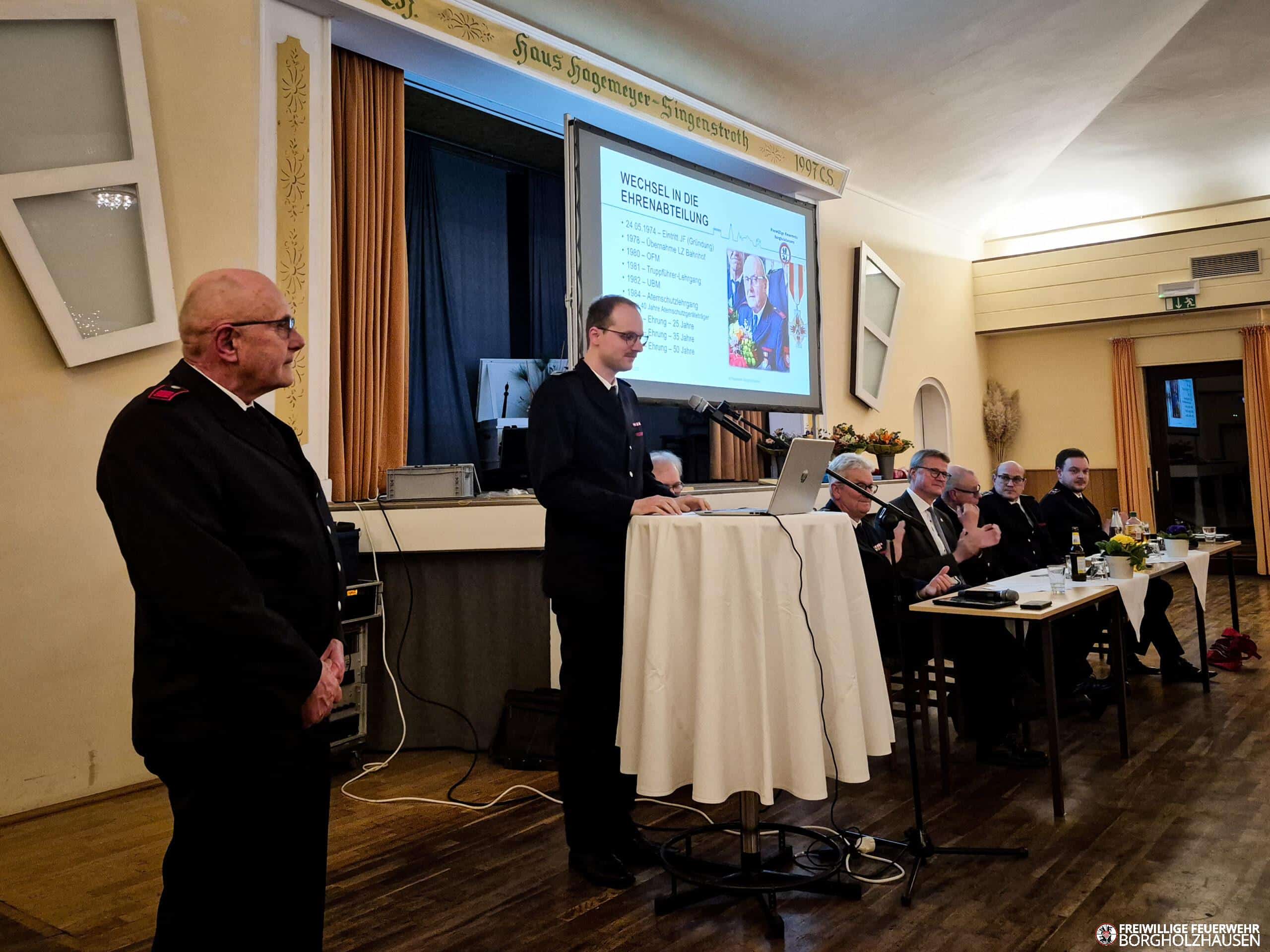 Ehrenabteilung. Seit 1974 engagierte er sich in der Feuerwehr – zunächst als Gründungsmitglied der Jugendfeuerwehr, später über 40 Jahre als Atemschutzgeräteträger und darüber hinaus als zuverlässiger Ansprechpartner für die Wartung von Motorsägen und Stromerzeugern. Seine Verdienste würdigte die Versammlung mit langem Applaus und tiefer Anerkennung.