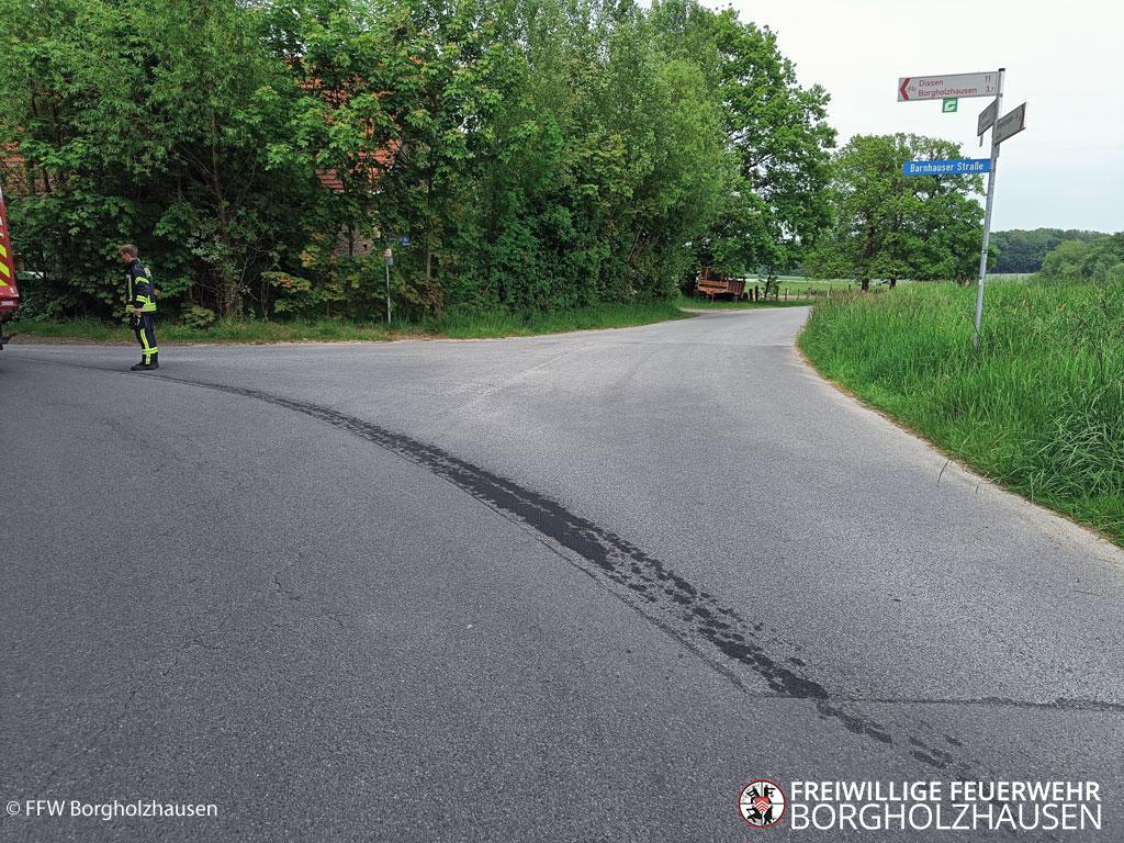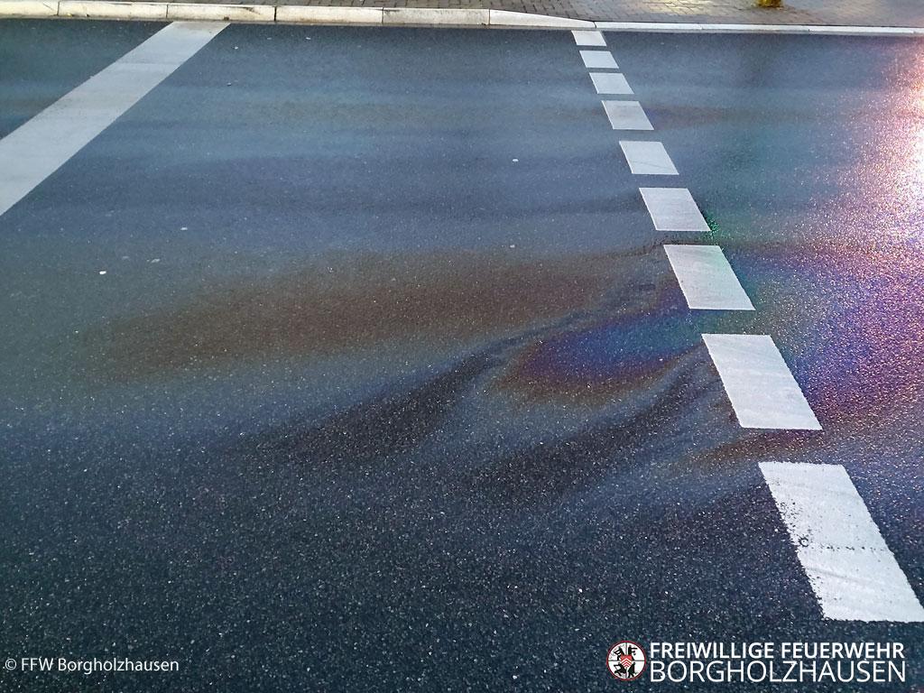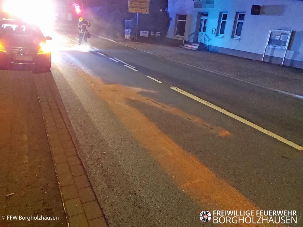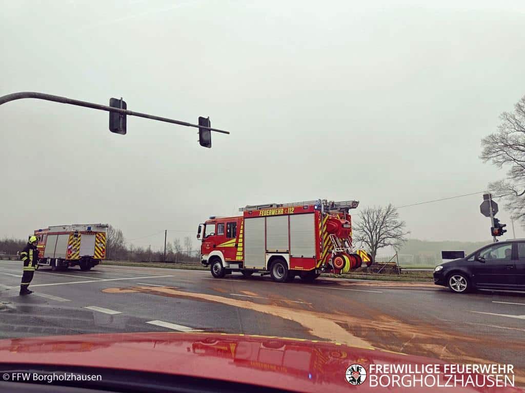 Lage bei Eintreffen: Die Einsatzstelle befand sich in der Autobahn-Abfahrt Borgholzhausen (aus FR Bielefeld kommend) im Bereich der dortigen Ampel-Kreuzung. Im Kreuzungsbereich war eine größere Verunreinigung durch vermutlich Motoröl festzustellen. Maßnahmen: Da die Polizei zu diesem Zeitpunkt noch nicht vor Ort war, wurde der Bereich der Autobahn-Abfahrt ca. 50 m vor der Ampel voll gesperrt. […]