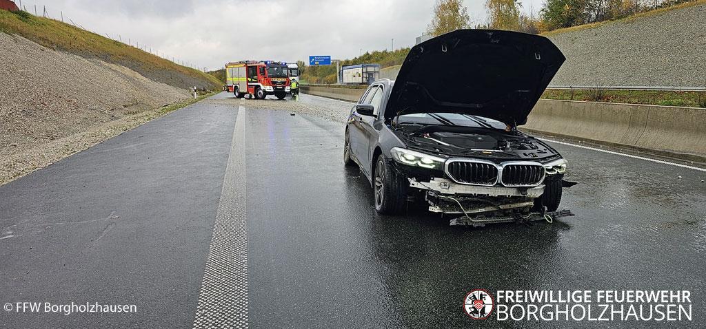 Meldung: Brennt PKW Lage bei Eintreffen: Auslaufendes Kühlmittel aufgrund eines Motorplatzers, ausgelaufene Betriebsstoffe. Maßnahmen: Abstreuen der Betriebsstoffe.