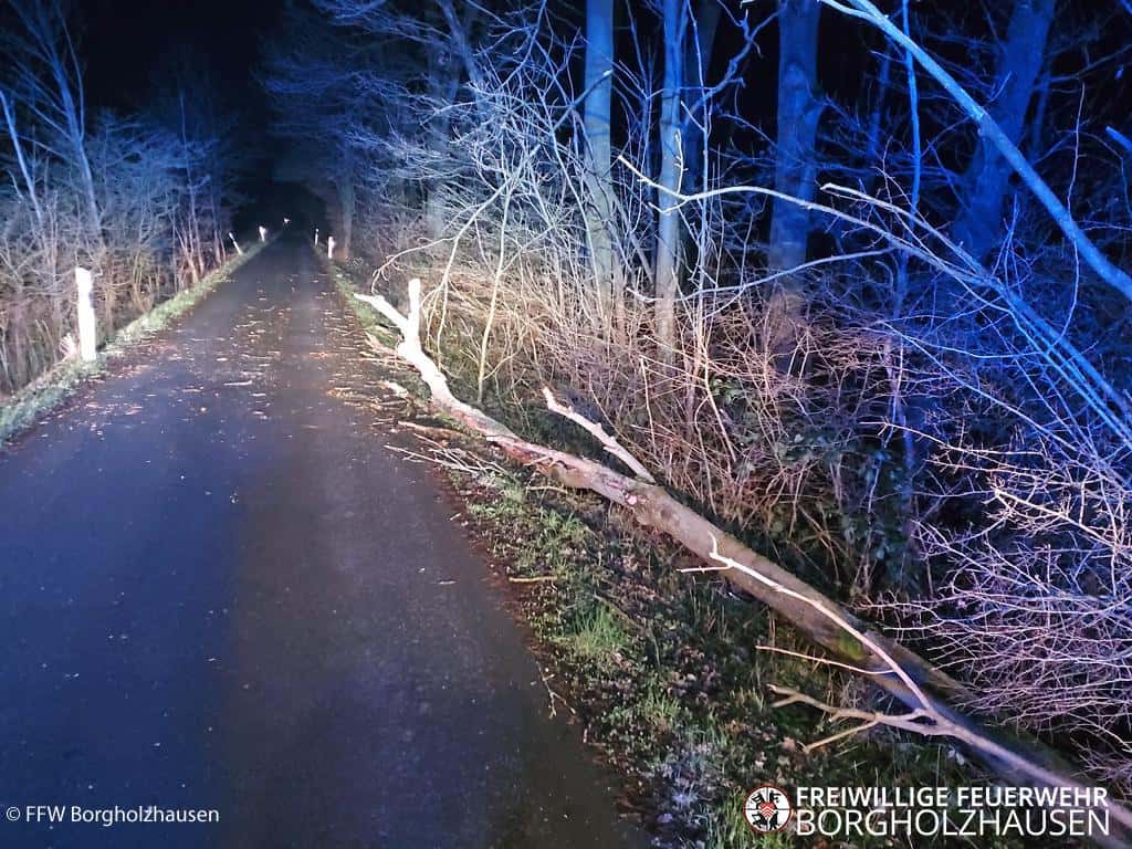 Meldung: Umgestürtzer Baum Lage bei Eintreffen: Ein ca. 30 cm dicker Baum war auf der Bielefelder Straße durch Windbruch niedergegangen und hatte die eine Hälfte der Fahrbahn blockiert. Maßnahmen: Baum mittels Kettensäge zerkleinert und Straße im Anschluss mittels Stoßbesen gereinigt.